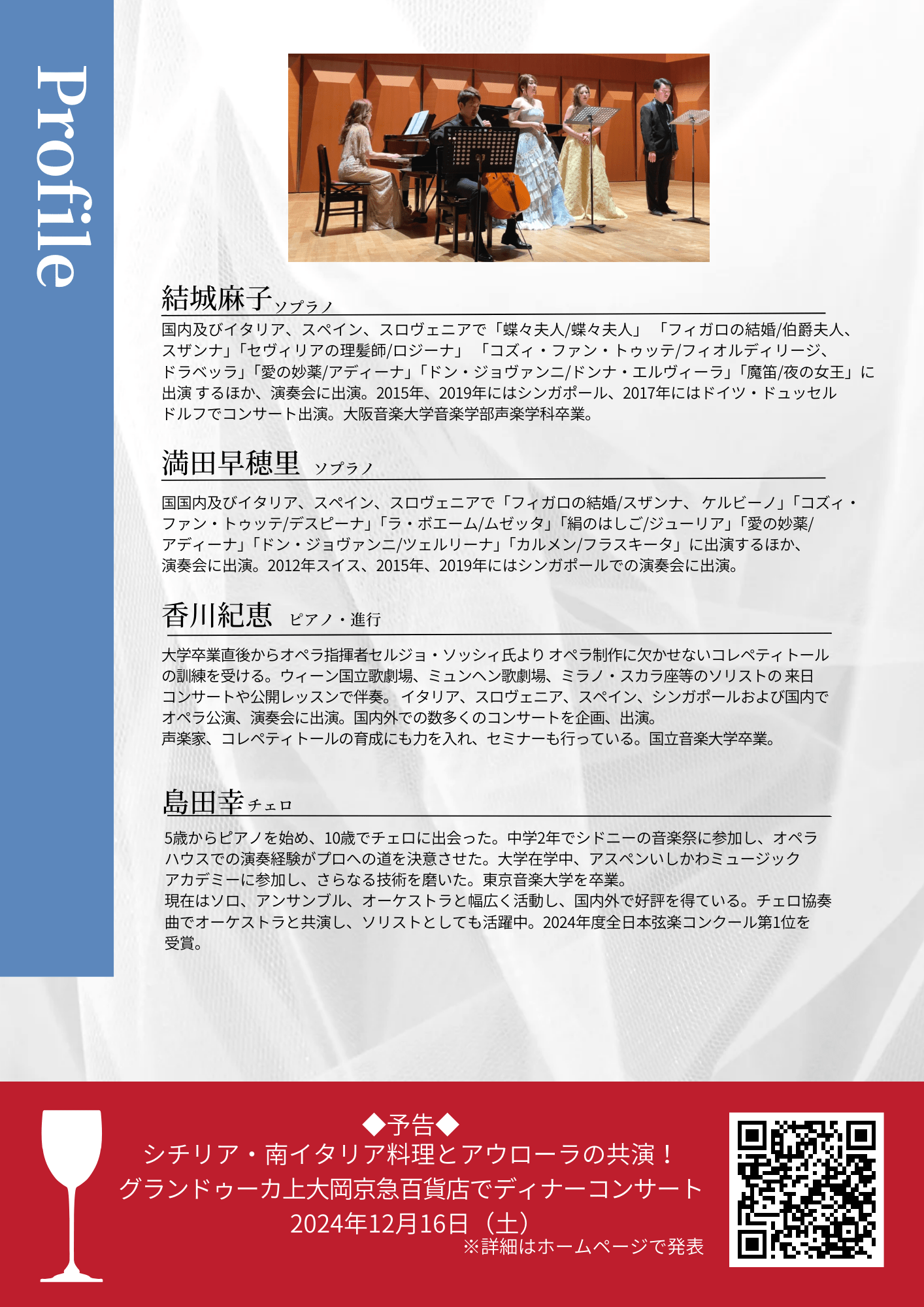 出演はアウローラの結城麻子(ソプラノ)、満田早穂里(ソプラノ)、香川紀恵(ピアノ)、そして仲間の島田幸(チェロ) 詳細・申込みはこちら